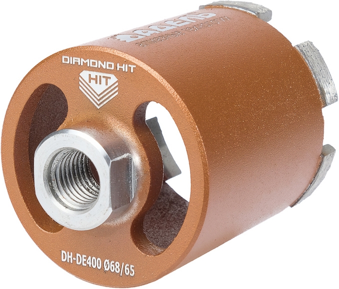 НОУ-ХАУ в сухом алмазном сверлении железобетона – новейшая передовая технология Diamond Hit !!! Алмазная коронка с пылеудалением для сухого сверления подрозетников с микроударом Адель Diamond Hit DH-DE400 68/65 мм (Adel Даймонд Хит ДХ-ДЕ400 68/65 мм) предназначена для сухого алмазного бурения бетона, железобетона с любой степенью армирования, кирпича, для монтажа подрозетников с использованием дрелей алмазного бурения с функцией микроудара.