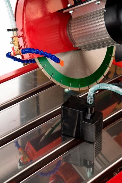 - Постоянная циркуляция охлаждающей жидкости: подача воды осуществляется с помощью водяного насоса (помпы) непосредственно в зону резки для охлаждения режущего диска и материала