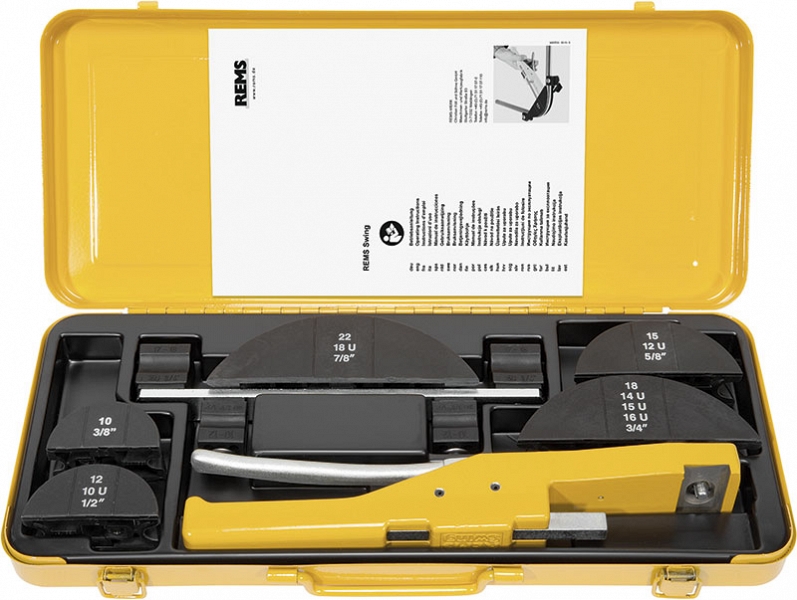 - REMS Свинг Сет. Ручной трубогиб для работы одной рукой Ø 10 – 32 мм, 3/8" – 7/8", до 90°. Мягкие медные трубы Ø 10 – 22 мм, 3/8"–7/8", s ≤ 1 мм, мягкие медные трубы с оболочкой Ø 10 – 18 мм, 3/8" – 5/8", s ≤ 1 мм, мягкие трубы из углеродистой стали с оболочкой для систем запрессовки Ø 12 – 18 мм, s ≤ 1,2 мм, мягкие прецизионные трубы из стали Ø 10 – 18 мм, s ≤ 1 мм, композитные трубы Ø 14 – 32 мм. До Ø 26 мм с приводом, гибочными сегментами, опорой скользящих роликов Ø 10 – 26 мм со скользящими роликами, в прочном ящике из листовой стали / кофре.