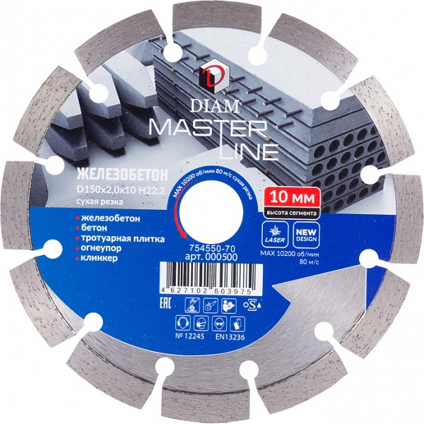 Сегментный алмазный круг Diam Master Line 1A1RSS Железобетон 150 мм (Диам Мастер Лайн 1А1РСС Железобетон 150 мм) – профессиональный алмазный отрезной диск для сухой резки бетона, армированного бетона (железобетона), тротуарной плитки, кирпича, клинкера, огнеупоров и других строительных материалов, схожих по характеристикам, на углошлифовальных машинах (ушм, болгарках), штроборезах и другом оборудовании, с подачей и без подачи воды.